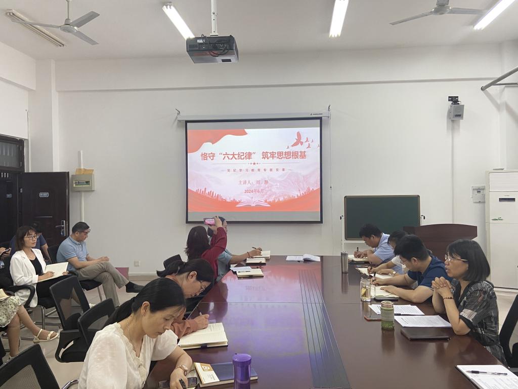随后,党总支书记刘静围绕新修订《中国共产党纪律处分条例》的内容,以《恪守“六大纪律”,筑牢思想根基》为题,结合自身学习感悟,阐述加强党的纪律建设的重要意义,通过简要释义、明确要求、详解负面清单及案例分析的方式,将正面引导和反面警示相结合,带领全体党员教师一起深入学习领悟党的“六项纪律”,提升规矩意识,筑牢纪律防线。刘静书记结合学院工作实际提出加强党的纪律建设的具体要求,强调全体党员教师要进一步强化纪律意识、加强自我约束、提高免疫能力,增强政治定力、纪律定力、道德定力、拒腐定力,始终做到忠诚干净担当,以良好的纪律作风做好本职工作,将党纪学习教育成果转化为迎接本科教学合格评建、“上层次、起高峰”高质量发展的具体行动和实际成效。